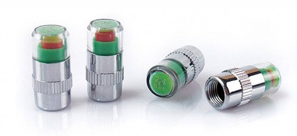 Существует датчик цвета для определения давления в шине. Он устанавливается на место обычного колпачка. Состояние покрышки определяется по цвету сектора штока. Например, зеленый цвет говорит о том, что давление в норме. А желтый показывает, что оно ниже нужного показателя на 0,3 атмосферы.