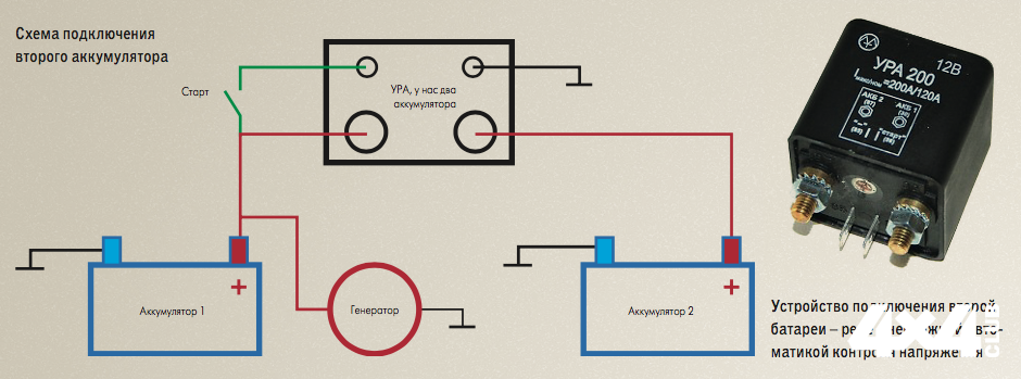1.Применение разделительного контроллера при подключении второго аккумулятора в машину, позволит заряжать АКБ поочередно и заряд использовать рационально. Коммутационные устройства представляют переключатели различных конструкций. Примером служат устройства развязки аккумуляторов (УРА), самый популярный – УРА 200. С помощью этого прибора можно использовать двойную энергию при работе лебедки или запуске мотора зимой.