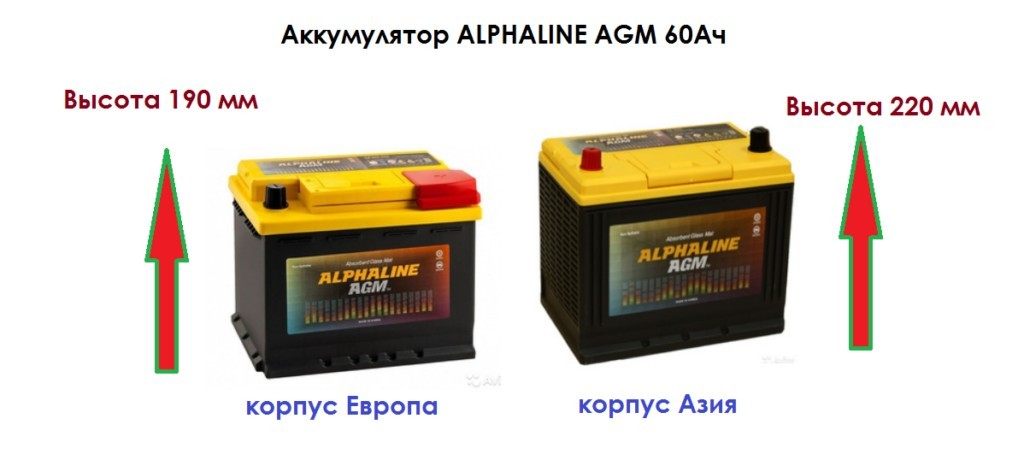 Европейские корпусы и американские имеют идентичные габариты. Например, у батарей емкостью 60 Ач общая высота от 17,5 до 19 сантиметров. У азиатских этот показатель немного выше, до 22 сантиметров за счет верхнего расположения электродов