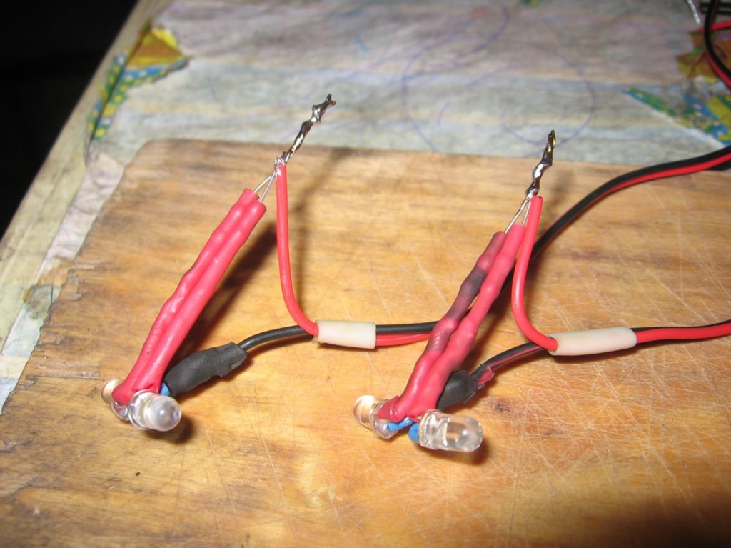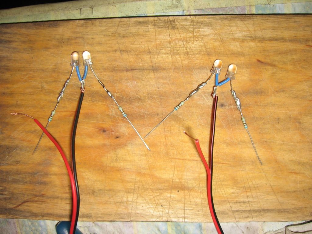Теперь припаиваем ножки светодиодам к проводам – важно не перепутать полярность.