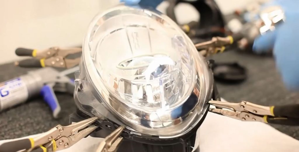 Отделив внутреннюю маску с отражателем от стекла, можно приступать к установке первого светящегося глазка. Для этого его прикладывают к маске и определяют место прокладки проводов. На обезжиренную поверхность кольца наносят клей, прижимают его к отражателю и оставляют до полного высыхания. Аналогичным образом приклеивают второе кольцо. Сборку фары производят в обратной последовательности, прогревая шов феном и плотно прижимая стекло к корпусу.