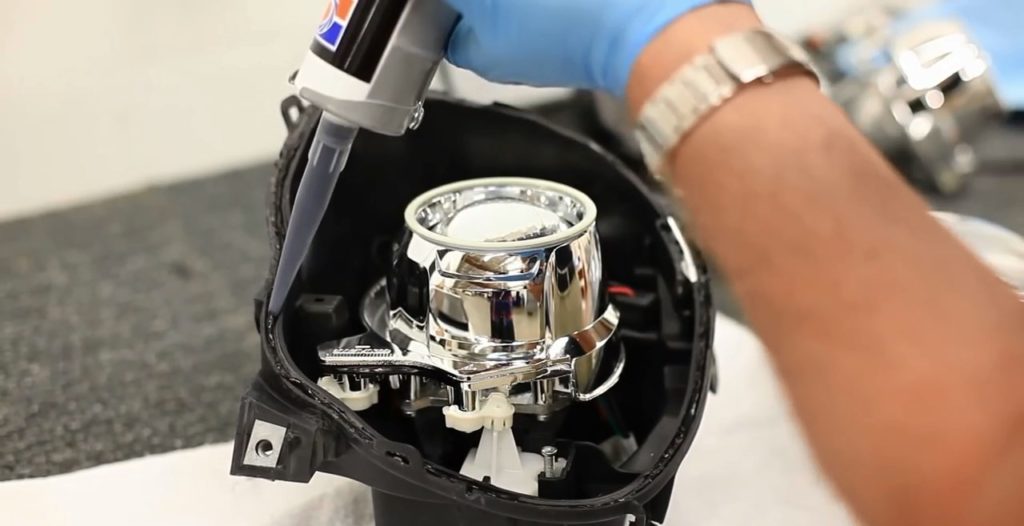 Когда кольца вмонтированы, при помощи герметика нужно заполнить пространство по краю фары между отражателем и стеклом. Этим действием мы вытесняем лишний воздух. Фары можно подключить к бортовой сети только тогда, когда герметик высохнет, а затем установить их на штатное место.