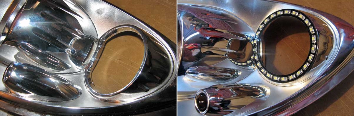 “Ангельские глазки” в фары с линзами устанавливаются на кожух. Его можно предварительно покрасить в чёрный цвет, чтобы кольца были лучше видны.