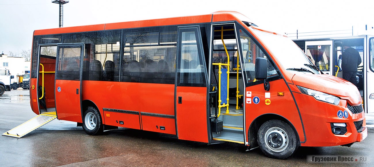В соответствии с тенденциями рынка, площадка напротив 2-й служебной двери отдана под место для перевозки инвалида-колясочника. Для этого на полу смонтирована откидная аппарель, а в пневмоподвеске предусмотрена функция книлинга. При отсутствии коляски вся задняя часть салона превращается в накопительную площадку, а с учётом центрального прохода приемлемой ширины, в автобусе можно стоя перевозить 24 пассажира.