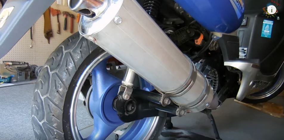 Во время снятия колес играет роль, какое колесо снимается – заднее или переднее. Это связно с конструкцией скутера в целом. Рассмотрим сначала, как снять заднее колесо на скутере. Первым делом для удобства следует снять глушитель.