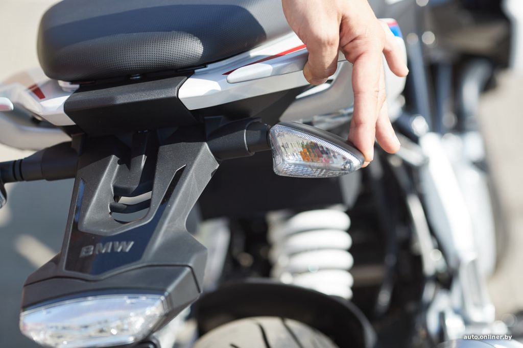 Конструкцию мотоцикла можно отнести к классу «стандарт». Минимум пластика, отсутствие стекла, комфортная посадка с достаточно высоким рулем и вес 158 кг. Стандартная высота сиденья — 785 мм, может варьироваться от 770 (для опционального низкого) до 800 мм (для высокого комфортного). Это означает, что даже у людей относительно невысокого роста будет возможность полностью поставить ногу на землю при остановке. При росте в 185 см сидеть на байке достаточно комфортно и коленям ничего не мешает. Само сиденье отлично фиксирует седока на месте благодаря выраженному упору сзади. Подножку можно легко выставлять ногой при помощи специального выступа, который есть на каждом байке BMW. Единственная претензия к эргономике — это рычаги сцепления и переднего тормоза, которые не имеют регулировки. Впрочем, это не является особой проблемой, так как их можно легко заменить. В будущем можно будет также заказать подогрев ручек как дополнительную опцию.