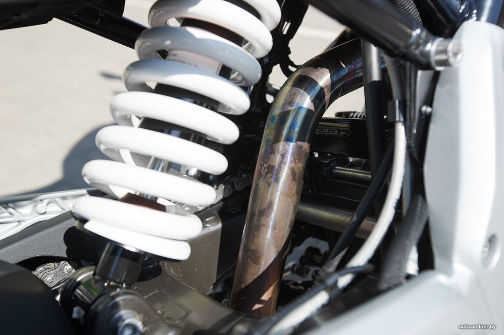 Тормоза имеют, на первый взгляд, неизвестную надпись на суппортах — BYBRE. Расшифровывается это как By Brembo. Это бюджетная версия тормозов от именитого производителя для малокубатурных байков и скутеров из азиатского и южноамериканского регионов. Для переднего колеса используется всего один тормозной диск, но тормоза работают, в общем-то, неплохо. Во-первых, байк легкий, во-вторых, он не разгоняется до высоких скоростей. Но самое, пожалуй, главное, это то, что обратная связь предсказуемая и понятная