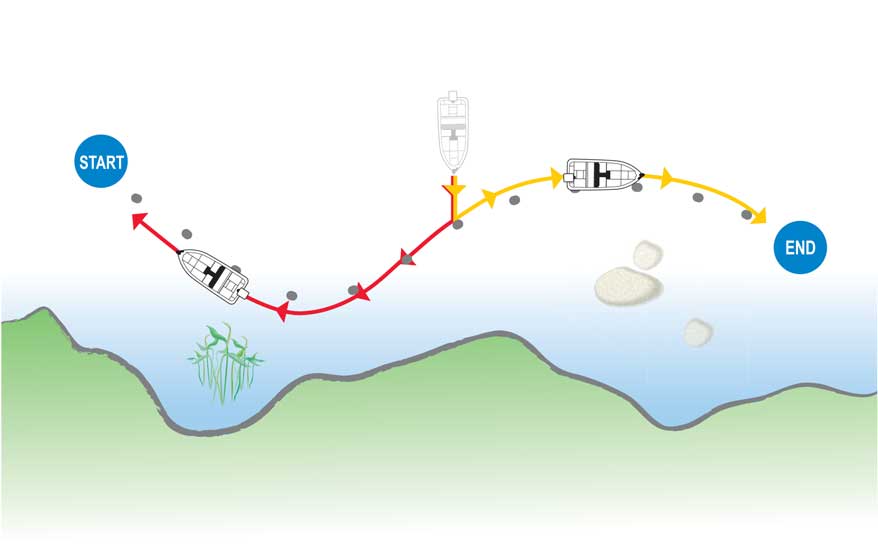 Предположим вы хотите еще раз пройти по уже записанному ранее пути. Как это сделать? Нажимаете на клавишу Track to Start или Track to End. Система определяет местонахождение лодки, находит ближайшую к вам точку выбранного маршрута и направляет судно к ней. После того как это место достигнуто, лодка двигается к следующей точке, затем к следующей пока не дойдет до начала или конца пути.