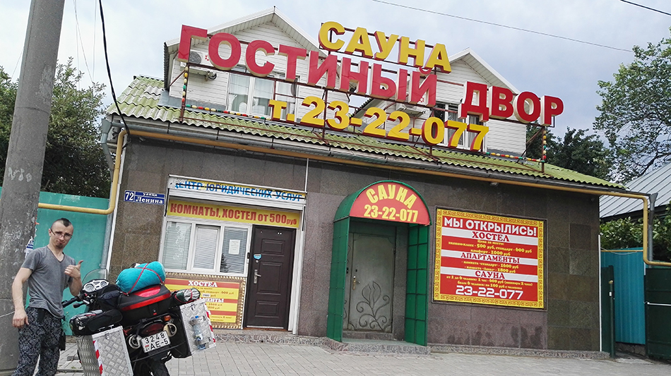 Сначала мы хотели заехать к Азовскому морю переночевать в палатке – это 60–70 километров от Ростова, не так далеко, но впечатлений больше. Но, когда до Ростова оставалось 20 километров, решили, что не поедем к морю: искать место, где стать с палаткой в такой ливень, не самая лучшая идея. Остановились, забронировали гостиницу. Цены на них возросли в связи с чемпионатом (чемпионат мира по футболу 2018 года в России. – Ред.), но мы нашли подешевле – лишь бы душ и кровать.