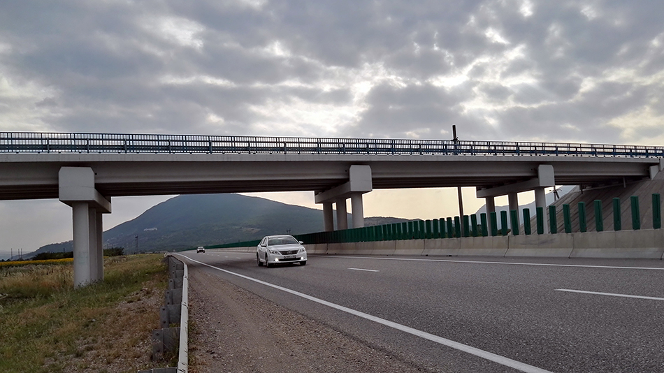 Ехали по дороге, обозначенной знаком «автомагистраль». Мне она напомнила дорогу из американских фильмов. Вокруг – поля и поселения, впереди – горы. По мере приближения к ним казалось, что облака уже щекочут их верхушки. Небо затянуло, впереди оно было совсем темное. Понятно, что едем в дождь.