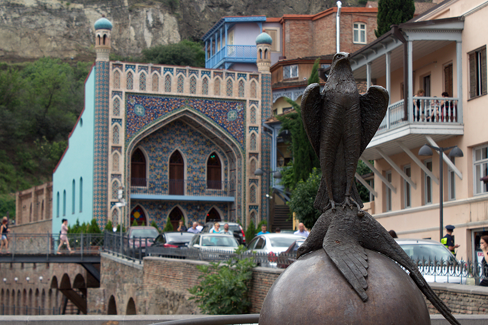 Тбилиси поражает своими контрастами: старые-старые дома, барельефы и скульптуры на зданиях, и вдруг – стеклянная высотка. На градуснике 31. Прохладно. Нет, я не шучу. Стало гораздо легче гулять и дышать, будто у нас при 23 градусах. Дошла пешком до знаменитого района серных бань. По легенде, именно отсюда начали строить город. Увидела водопад и сфотографировалась с ястребом.