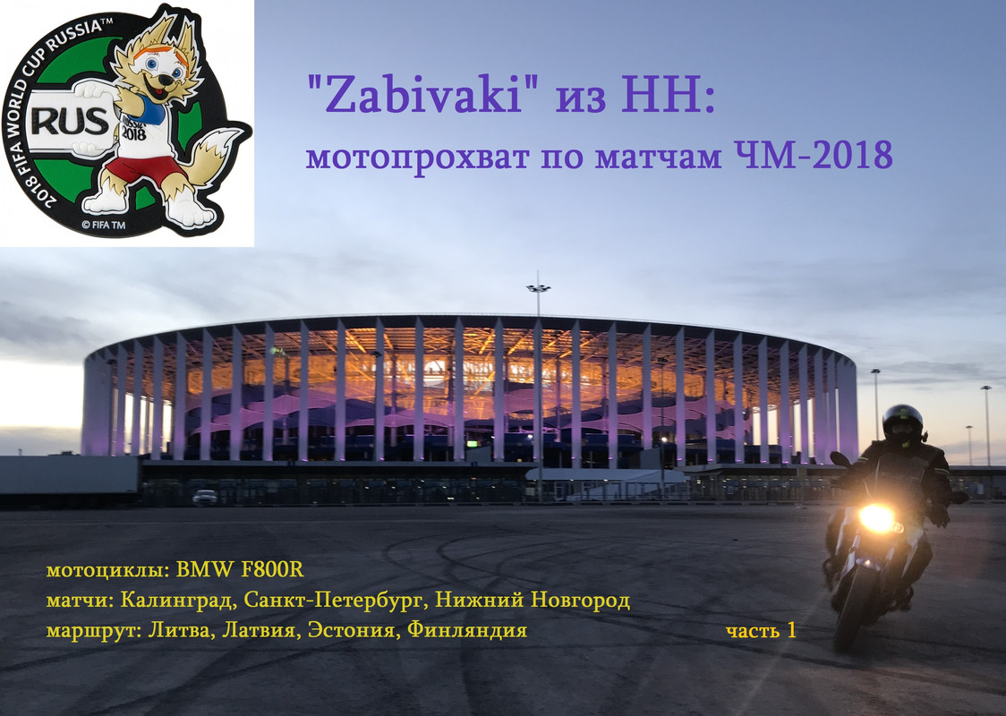 Чемпионат мира по футболу 2018 года отгремел в 11 городах России на 12 стадионах. Иностранные болельщики залили пивом и плотно накрыли песнями-кричалками центры наших крупных городов. Нижний Новгород тоже построил стадион и принимал матчи ЧМ, но сидеть только в своём городе и не увидеть всю эту вакханалию на других стадионах — скучновато. Тем более если в кармане билеты на три матча: в Калининграде, Санкт-Петербурге и в родном НН. Ну а раз уж в планах есть Калининград и Питер — маршрут закольцевался сам собой. Появилось желание использовать эту возможность и прохватить на мотоциклах по заповедной Куршской косе, Литве, Латвии, Эстонии и озерам Финляндии, благо временные промежутки между матчами вполне позволяют это сделать. Отправились в летний трип болеть «за красивую игру». На черно-белом FR-е Леха и Люда, знакомые вам по предыдущим постам, я одиночно на синем. Три «Забиваки-на-работу» едут на футбол). Олеее-Оле-Оле-Олееееееее…
