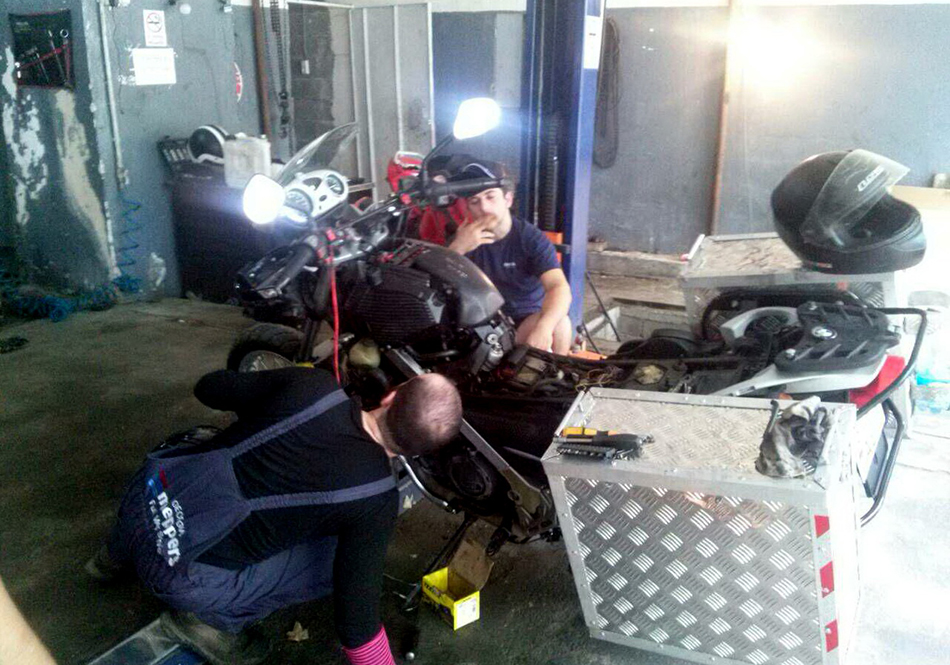 Познакомились с местным байкером. Завтра повезет Богдана немного починить наш мотоцикл. Вечером позвал нас в кафе на их тусовку.
