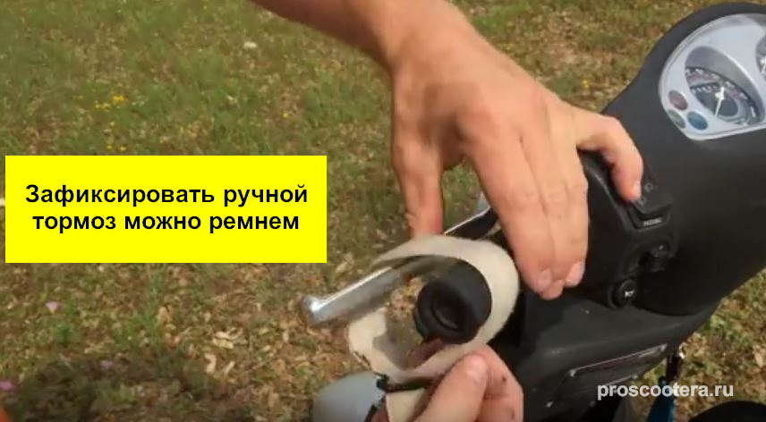 Вы сможете поменять колесо на скутере, как только зажмёте задний тормоз и открутите гайку.