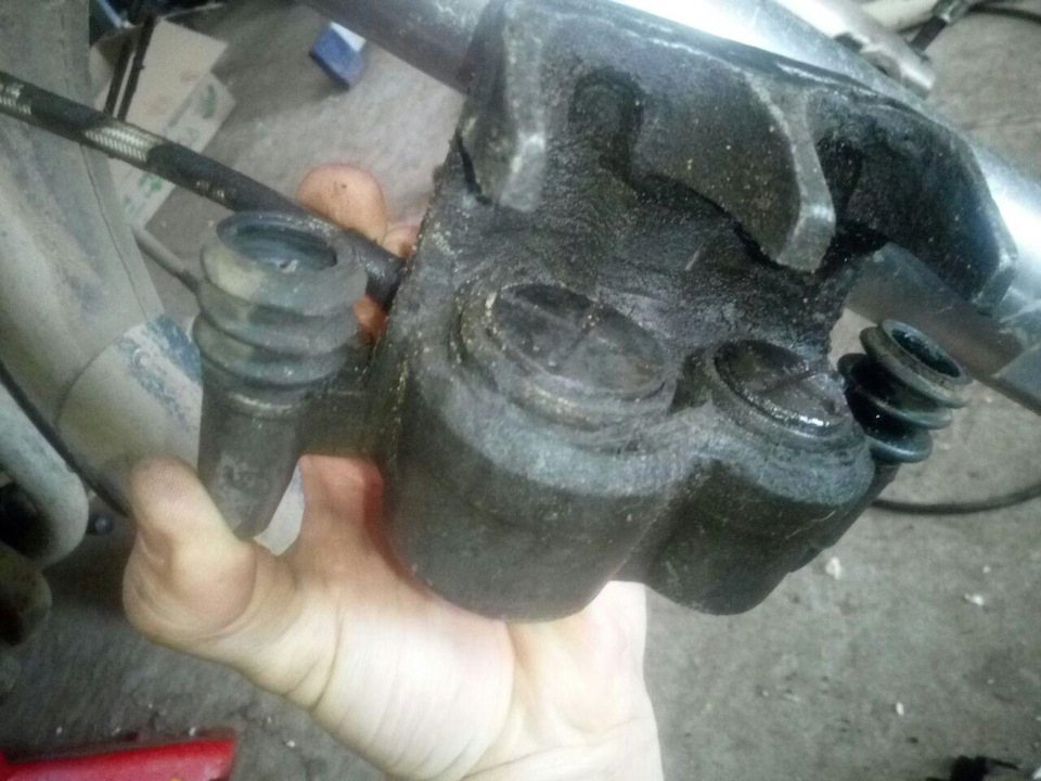 Обнаружил в ходе профилактики где-то за месяц до сезона полный привет в переднем суппорте. Пыльники потеряли форму и размер, на поршнях раковины, манжеты пропускают тормозную жидкость. Соответственно, весь узел плавает в тормозухе с грязью.