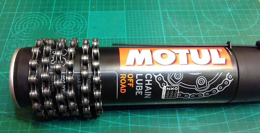 Брызгаю я на каждый отдельный пин, велик предварительно переворачиваю и ставлю спереди на большую звезду. После пробрызгивания — обычной тряпкой стираю излишки снаружи — а внутри останется ровно столько, сколько нужно. Тонкий слой смазки снаружи все равно остается, и цепь не ржавеет от сырости. Пыль эта смазка не собирает по-сухому, Мотюль свое дело знает.