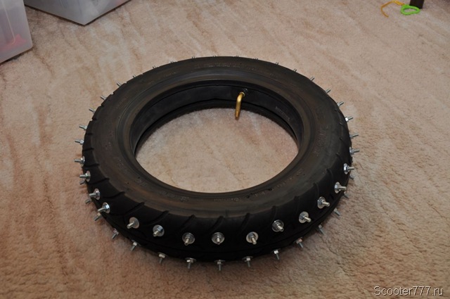 У меня были две ненужные летние покрышки и диск. Зимой я соскучился по скутеру и решил сделать себе «зимнюю» резину, ошиповав её болтами с гайками. Докупил второй диск, а также необходимые метизы. Поскольку множество просверлённых в покрышке дырок не способствует её герметичности, я решил поставить вовнутрь камеру. Делал это впервые, без теоретической подготовки, поэтому получилось всё не сразу. Я хочу подробно рассказать об этом процессе.