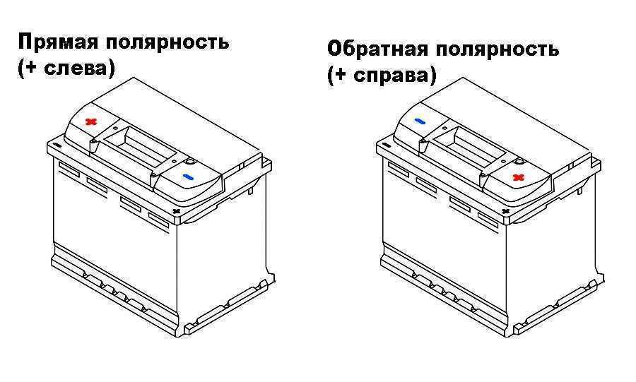 Клемма «плюс» всегда толще, чем отрицательная. Это уменьшает ошибки при подключении. Их расположение (полярность) может быть или прямой или обратной. Прямая полярность – плюс слева, обратная – справа.