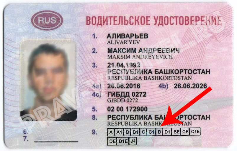 На лицевой части располагается фотография водителя и основные данные о нем (ФИО, дата и место рождения), а также срок действия, серия и номер ВУ, название подразделения ГИБДД, выдавшего документ, регион регистрации автомобилиста. В графе 9 указываются все разновидности автомобилей, которыми может управлять водитель (в том числе, и D).