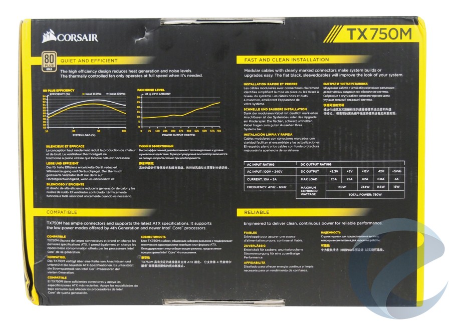 Тыльная сторона упаковки Corsair TX750M весьма богата на техническую информацию о продукте, включая кросс-нагрузочные характеристики, режим работы вентилятора, спецификацию и описание особенностей устройства. Информация представлена на пяти языках, включая русский.