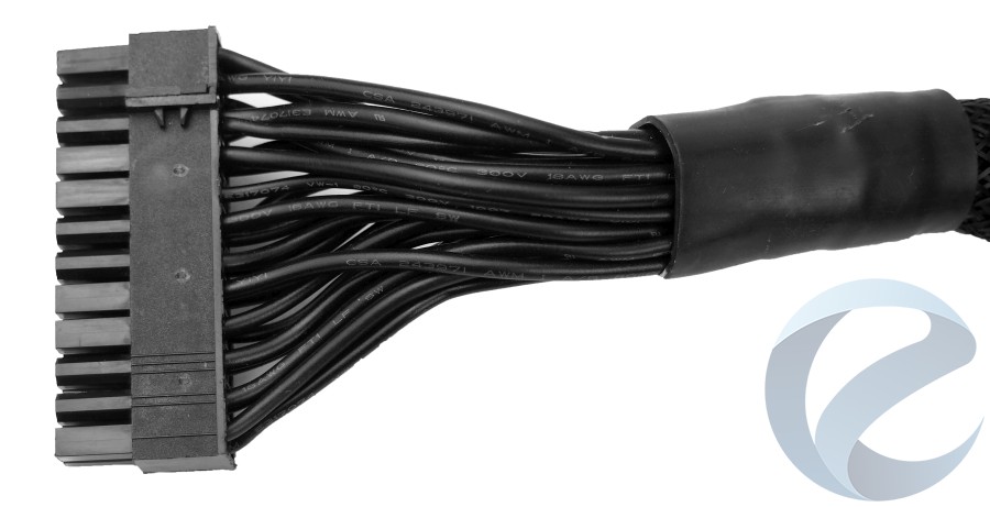 Производитель предоставляет достаточно скромную информацию о Corsair TX750M относительно используемых в его производстве проводов. Только на основном коннекторе питания 24-пин можно увидеть маркировки проводов, среди которых присутствуют 20 AWG, 18 AWG и 16 AWG в зависимости от рабочей нагрузки соответствующего провода.