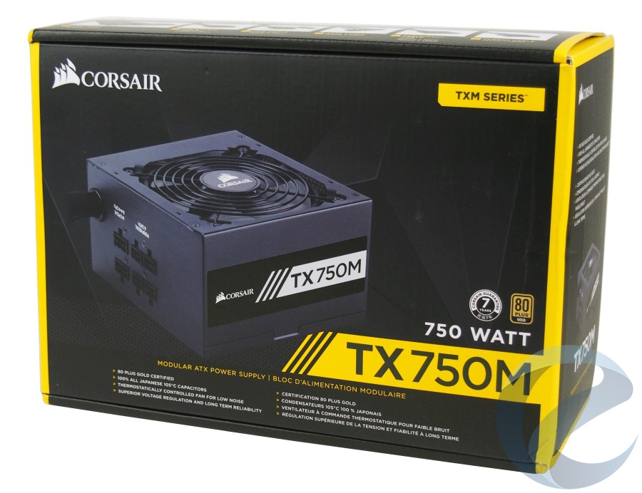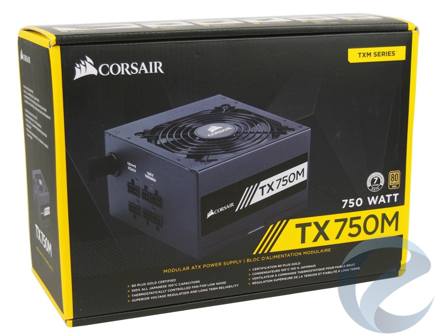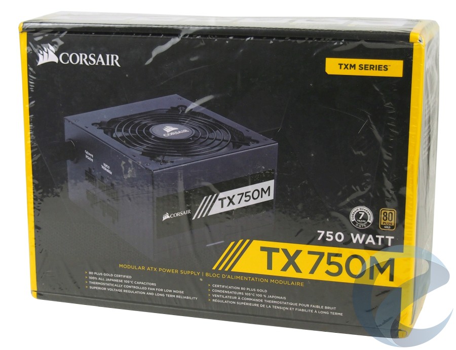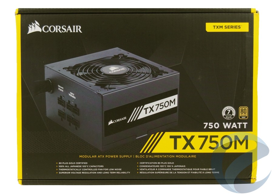 Обновленный Corsair TX750M получил Gold сертификат, поэтому использование желтого цвета в оформлении картонной упаковки – далеко не случайность. Сама коробка блока питания, несмотря на доминирование черного цвета, оформлена весьма красочно и информативно.