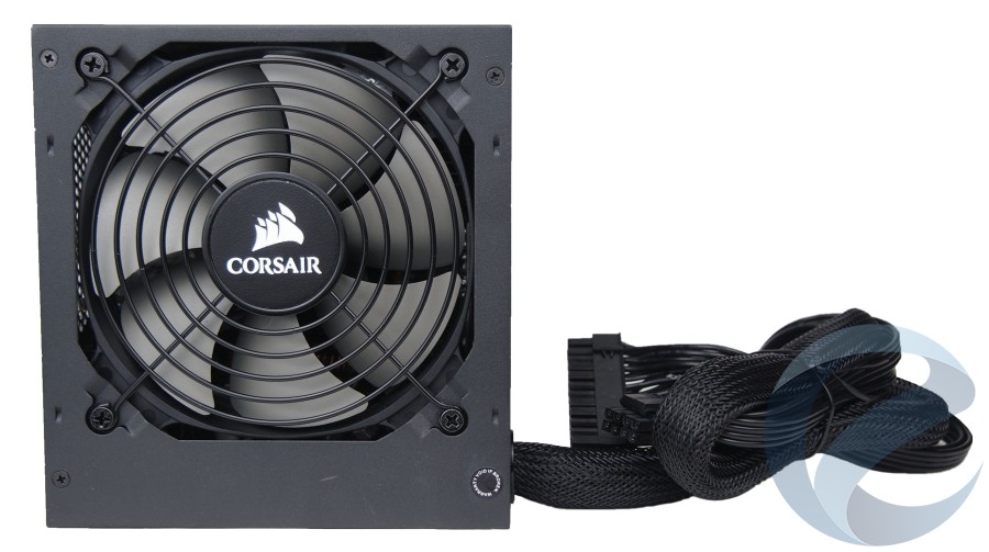 Для охлаждения компонентов Corsair TX750M используется 120-мм вентилятор. Сверху он закрыт проволочной “гриль”-решеткой, по центру которой располагается логотип и наименование производителя.
