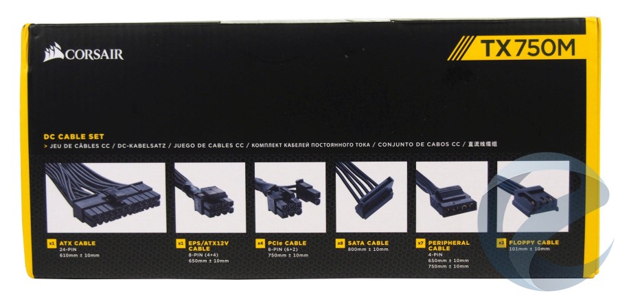 Верхняя грань упаковки блока питания содержит данные о перечне и количестве коннекторов подключения, которыми обладает Corsair TX750M. Информация доносится до потребителя, как с помощью фотографий, так и с помощью текста. Подробно указаны не только количество и тип коннекторов, но и их длина в мм.