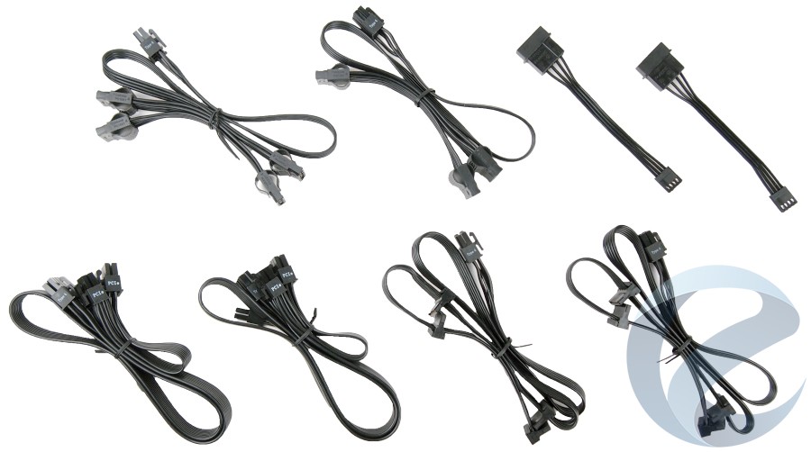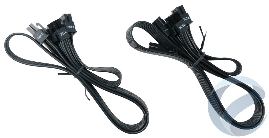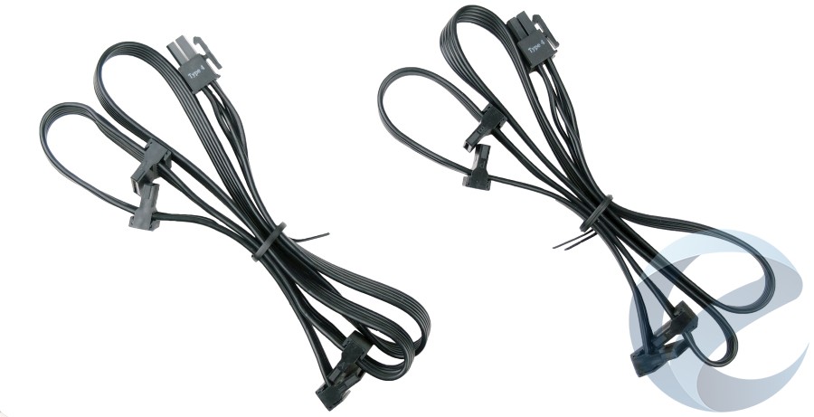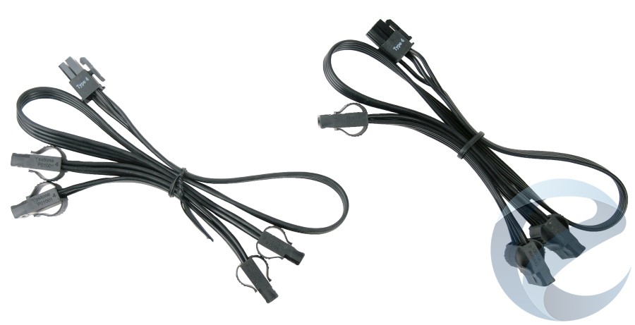 Corsair TX750M комплектуется двумя модульными кабелями с коннекторами PCIe. Каждый из кабелей имеет два коннектора 6+2 пин. Длина кабеля составляет 600 мм от коннектора подключения до первого PCIeи +150 мм – до второго PCIe. Данный набор кабелей из четырех коннекторов позволит подключить до двух мощных видеокарт с потреблением питания до 300 Вт или одну видеокарту с потребления питания свыше 300 Вт.
