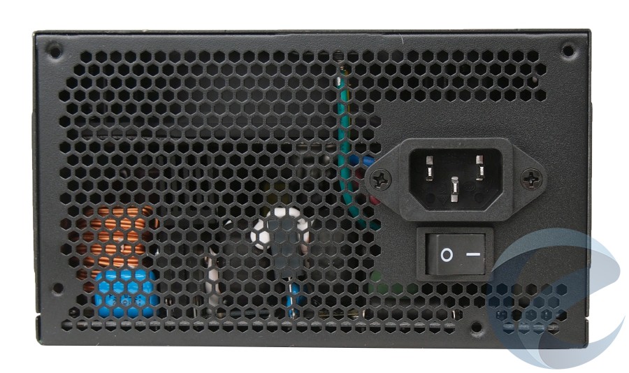 Большая часть тыльной стороны корпуса Corsair TX750M имеет вентиляционные отверстия в виде сот. Здесь же находится разъем питания и тумблер включения.