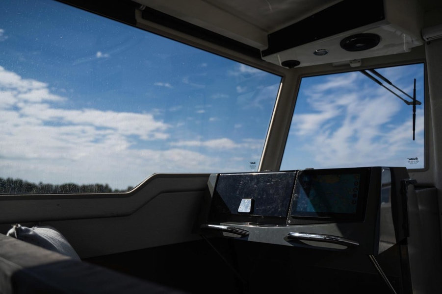 Не смотря на большую каюту, открытый кокпит также имеет вполне внушительный размер. Вместо кормового дивана в кокпите организованы два сиденья у бортов, между которыми выход в моторное отделение. Кокпит может быть закрыт ходовым тентом, который входит уже в стандартную комплектацию.