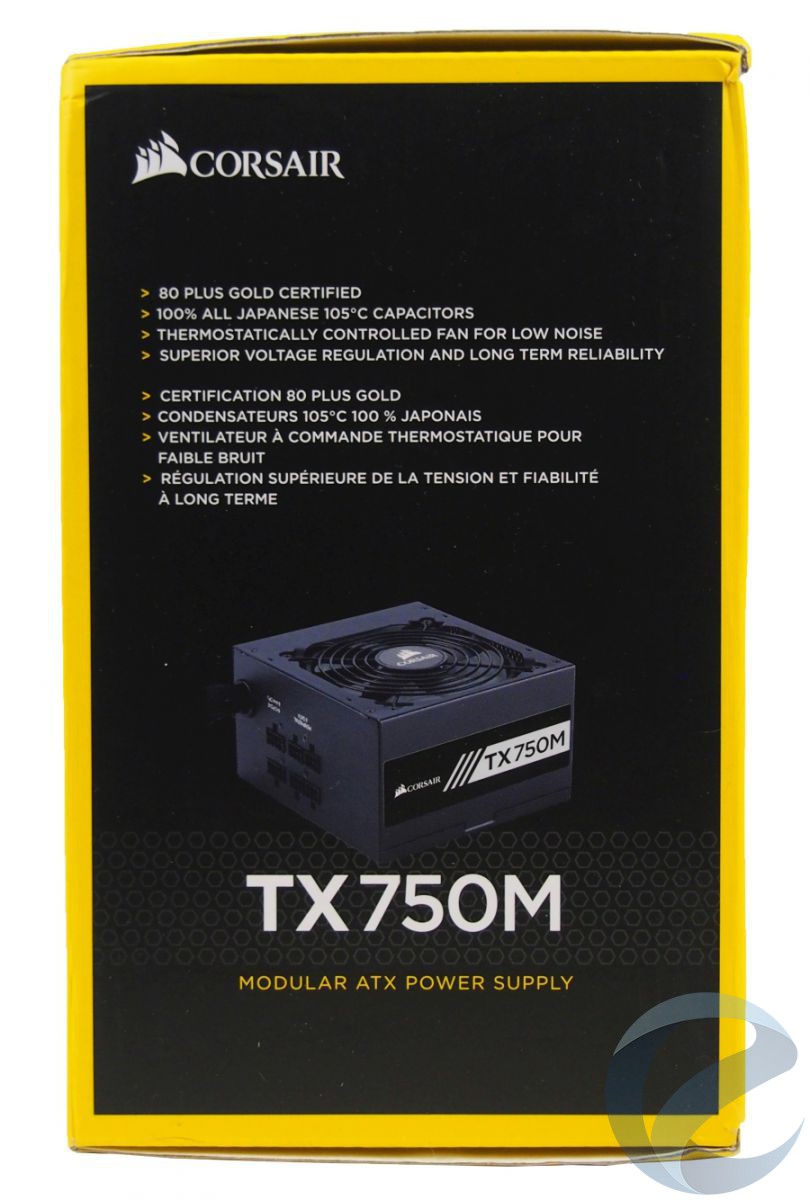 Торцевая грань упаковки Corsair TX750M также дублирует информацию о важных особенностях продукта. Производитель выделяет в Corsair TX750M прежде всего Gold сертификат, использование качественных японских конденсаторов с рабочей температурой до 105 градусов Цельсия, термический контроль работы вентилятора и надежность.