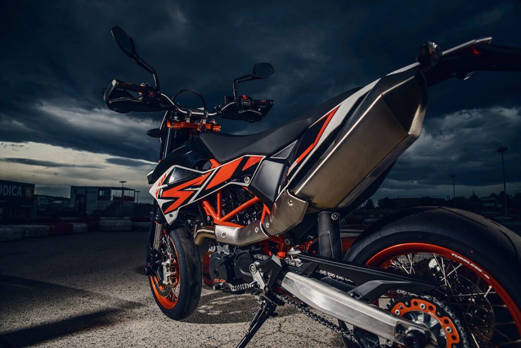 Зато в плюсе у KTM 690 SMC сухая масса чуть более 140 кг, великолепная управляемость, цепкие тормоза с АБС, энергоёмкие подвески и возможность творить вообще всё, чего захочется мотоциклисту. Бешеный разгон до максимальной скорости, которая едва-едва не дотягивает до 200 км/ч? Запросто. Экстренное торможение без риска пойти юзом? Тоже легко. KTM 690 SMC может с лёгкостью уйти со светофора на заднем колесе, вписаться в пространство между машин, не снижая скорости, скатиться с лестницы и спустя пару секунд исчезнуть в неизвестном направлении, оглашая окрестности рёвом выхлопа. Он такой! Тормозит мотоцикл тоже очень эффективно, 320-мм и 240-мм диски вкупе с суппортами Brembo делают своё дело. В бензобак KTM 690 SMC влезает аж 14 литров топлива, и при размеренной езде оно расходуется экономно, порядка 4,5л на 100 км, но кто ездит на этом мотоцикле размеренно? При агрессивной езде расход можно смело умножать на два.