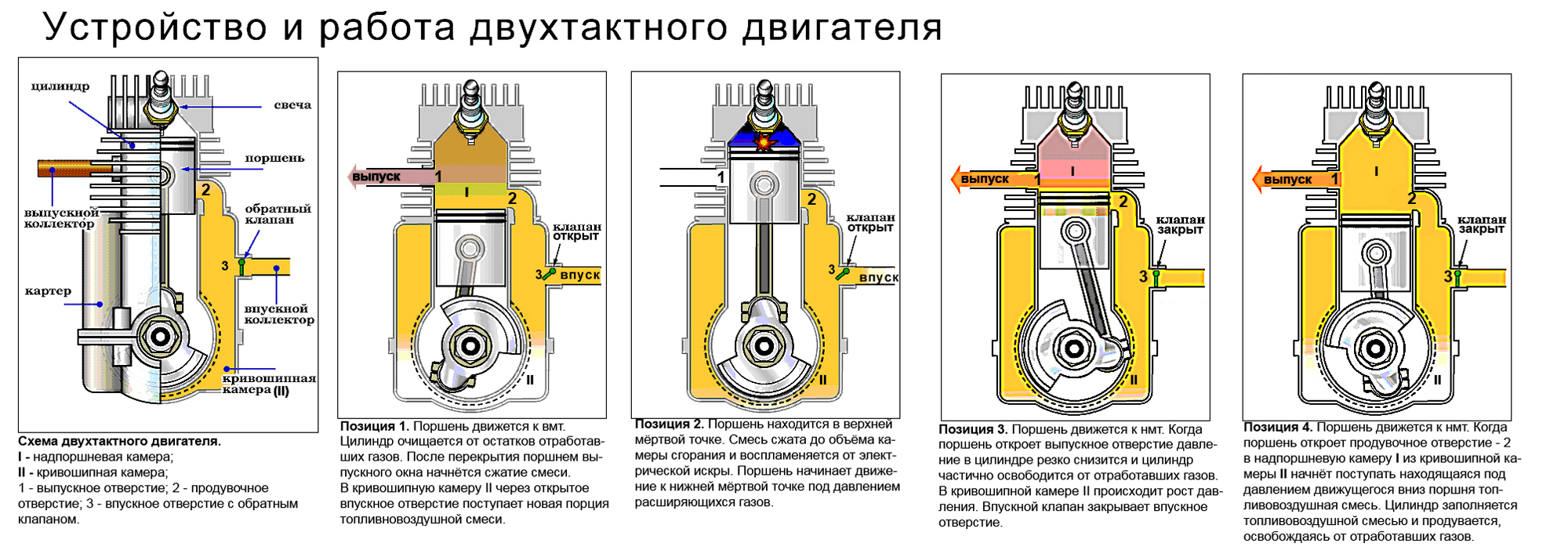 Работа двухтактного бензинового двигателя внутреннего сгорания