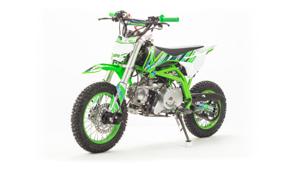 Для детей постарше уже существуют более серьезные модели, например, Motoland CRF10 и Motoland Apex10. Это по сути братья, отличающиеся только внешним видом. Они больше предыдущих моделей, длина 140 см, высота по седлу 63 см. И тяжелее, сухой вес уже 56 кг. Размер колес 12/10. Рассчитаны на детей в возрасте от 7 до 12 лет. И эта техника, в отличии от предыдущей, более взрослая во всех смыслах. Во-первых, двигатель здесь уже значительно более мощный. Он четырехтактный, так что масло с бензином смешивать не придется. Обладает объемом 110 см3 и мощностью 5 л.с. Этот движок довольно бодро везет даже взрослых дядек, а детей так и подавно. Хорошо то, что на ручке газа есть ограничитель мощности. И кстати, на этих мотоциклах уже присутствует электростартер. Трансмиссия, также вариатор. Подвеска более совершенная, правда и чрезмерно жесткая. Тормоза дисковые гидравлические. Главным же недостатком, по сравнению с младшими моделями, является заметно подросшая цена, 42000р.
