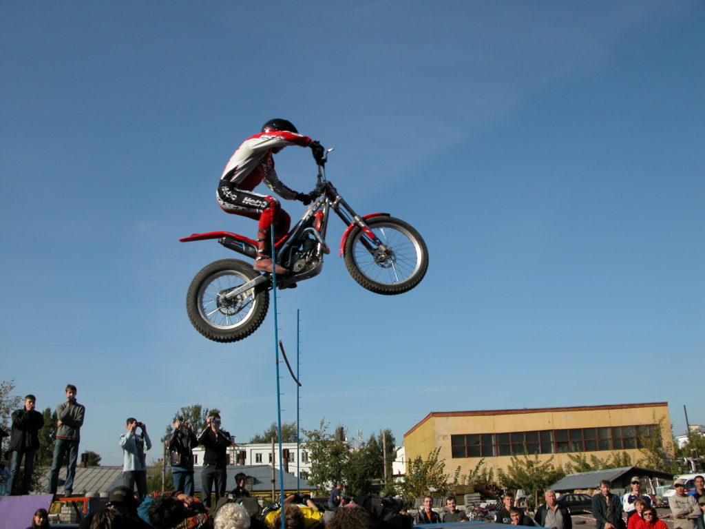 Особо опасный трюк можно выполнить лишь на легком кроссовом байке. Кроме транспорта здесь необходим еще и трамплин. Взлетая с трамплина, мотоциклист отпускает руль, держась за седло, и парит над мотоциклом.