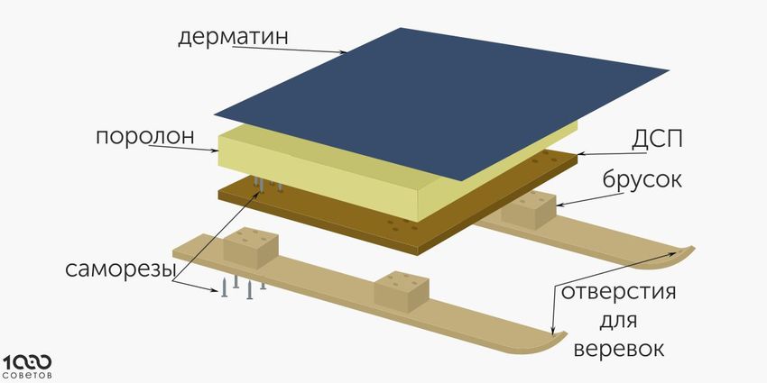 - Чтобы полозья лучше скользили и не стирались, можете обить их нижнюю часть полосой из тонкого алюминия.