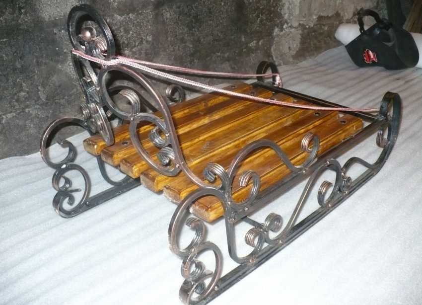 - Металл. Тут сразу вспоминается классический детский вариант с алюминиевым каркасом, обшитым дощечками. Но даже алюминий достаточно тяжёлый по весу и непростой в работе, чтобы из него самостоятельно собрать удобные и визуально интересные сани, не говоря уже о стали или чугуне, которые готовое изделие вообще превратят в «недвижимое имущество»;