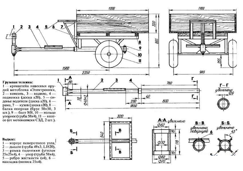 Чертежи для тележки лучше разработать самостоятельно, исходя из характеристик вашего мотоблока. Мы предлагаем для ознакомления типовую конструкцию.