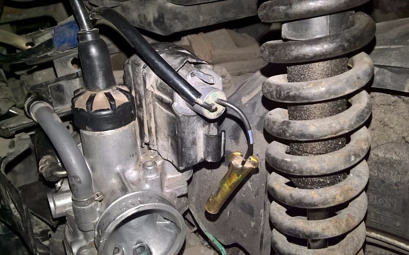 Итак, как проверить пусковой обогатитель скутера на исправность. Для этого, отсоедините питание обогатителя от электросети скутера, открутите крепление обогатителя к карбюратору и извлеките его.