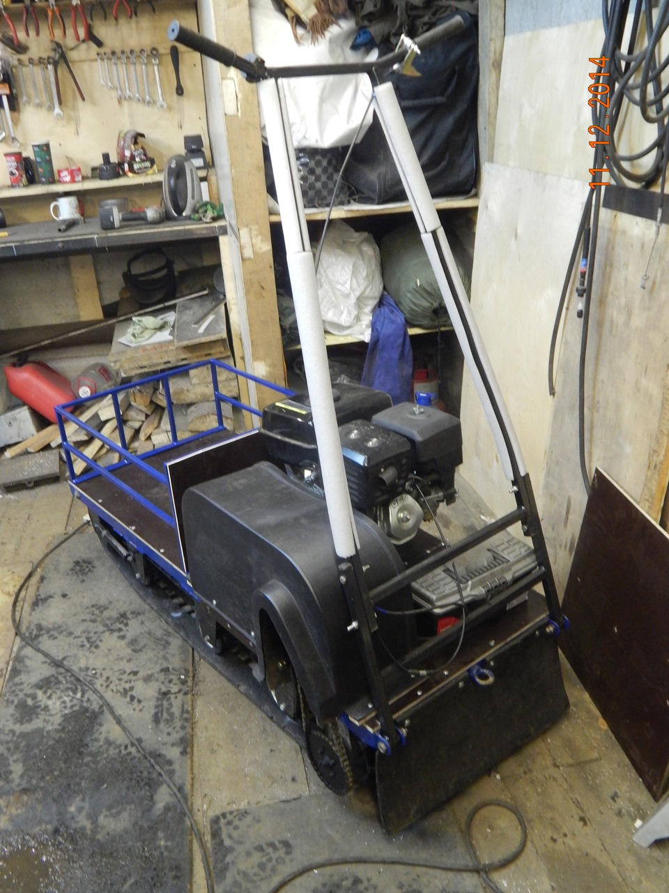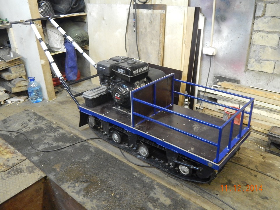 Гусеницы мотобуксировщика, как говорилось выше, изготавливают собственными руками из транспортерной ленты шириной больше 30 сантиметров или приобретают готовые, только последние потребуется разделять и делать шире посредством вставок. Траки делают из дерева, пластмассовых труб либо демонтируют со старенького снегохода. На КПП, двигатель устанавливают шкивы, соединяющиеся приводным ремнем. К рулю фиксируют компоненты управления мотобуксировщиком – рукоятка сцепления устанавливается с левой стороны, рукоять газа – с правой. Руль фиксируют на каркасе посредством сварки двумя трубами с вилкой. Вилка устраивается на задней оси и фиксируется приваренными металлическими шайбами.