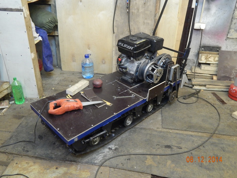 На буксировщике установлены 380-мм бурановская гусеница на 57 шагов общей длиной 2878 мм, также бурановские валы и 3 симметричные тележки. Двигатель Lifan 170F-TR, мощностью 8 л.с. с автоматическим редуктором. Самый мощный из небольших и легких двигателей Lifan. На 9 л.с. гораздо тяжелее.