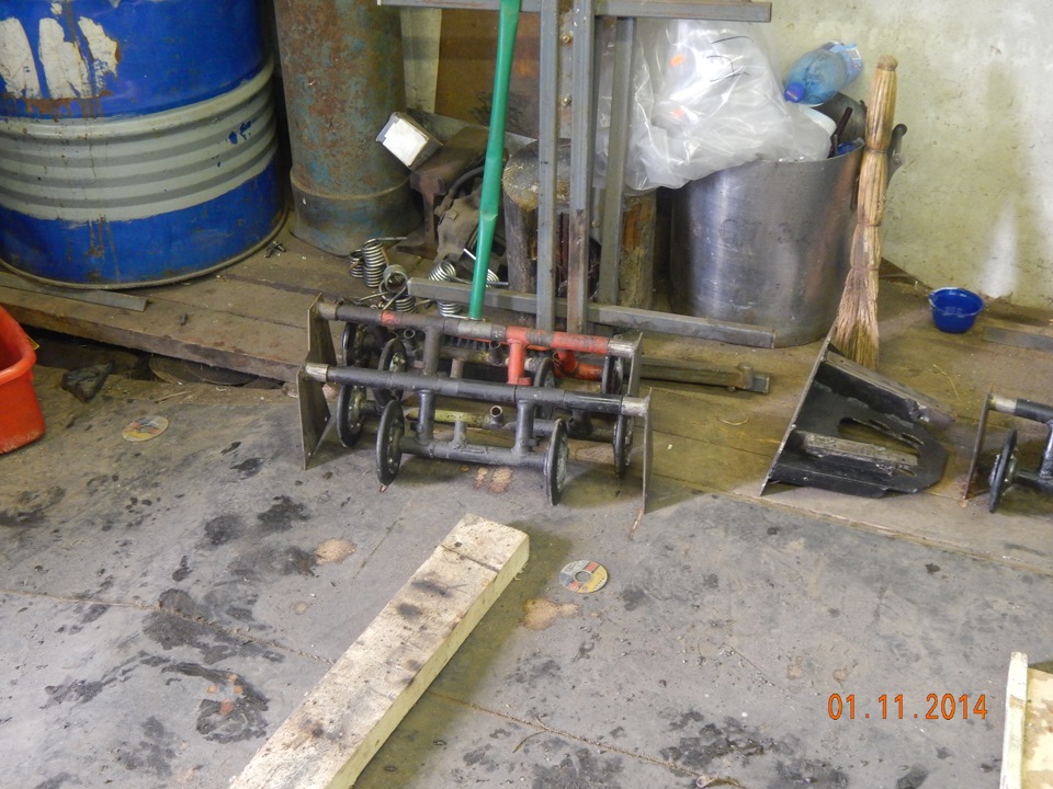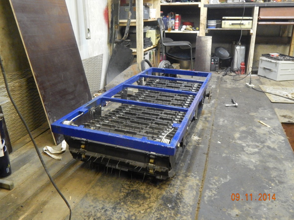 Сварив по чертежам раму, к ней крепят опоры для гусеницы, валы с катками и ставят гусеницу.