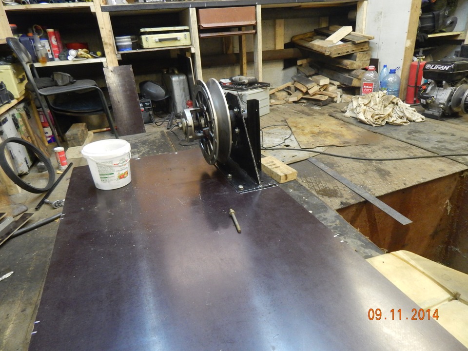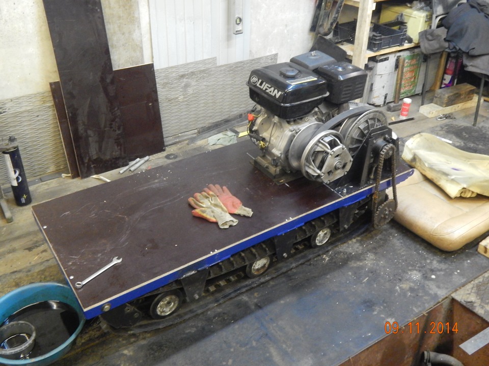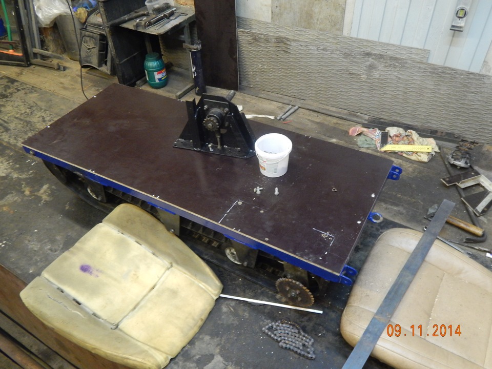 Следующий этап – монтаж платформы из толстой фанеры или стального листа и крепление на ней двигателя, вариатора и приводной цепи.