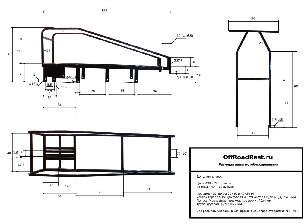 Основной идеей при постройке мотобуксировщика было создание максимально прочной, надежной и универсальной конструкции при минимальных расходах. Именно поэтому мы не особо заморачивались с покраской, прицепным устройством и отказались от кожуха, защищающего двигатель от холода. Но при этом мы не стали экономить на толщине металла и качестве комплектующих.