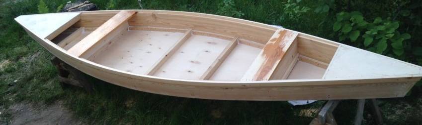 После отделки верхней и внутренней частей корпуса нужно прикрепить шурупами по два бруска к верхним внутренним сторонам шпангоутов. На каждые две пары следует уложить на саморезах две широкие баночные доски для сидения гребца и пассажира. Их тоже нужно будет прогрунтовать и покрыть бесцветным лаком.