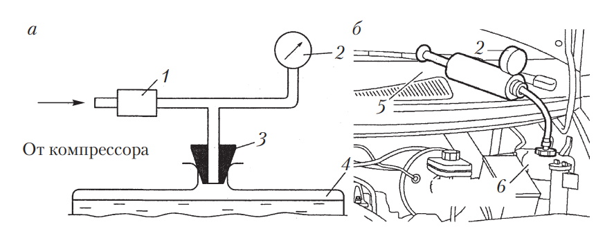 Рис. 1. Проверка герметичности системы охлаждения с использованием воздушной сети (а) и воздушного насоса (б): 1 — пневморедуктор; 2 — манометр; 3 — герметизирующая насадка; 4 — радиатор; 5 — насос; 6 — пробка расширительного бачка