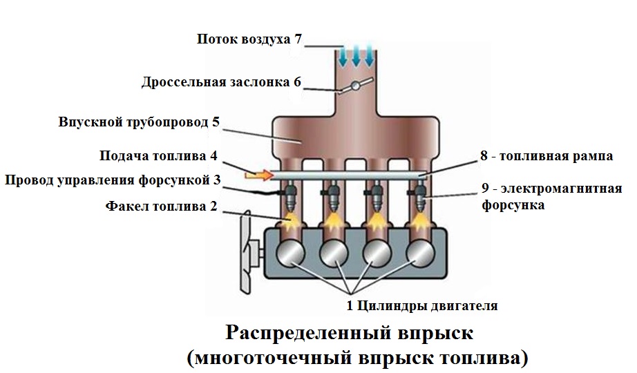 Распределенный впрыск – для каждого цилиндра установлена отдельная изолированная форсунка во впускном коллекторе, вблизи впускного клапана.