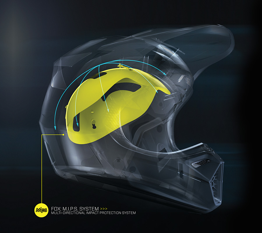 Уровень защиты, кстати, растет постоянно вслед за техническим прогрессом. Совсем недавно компания Fox начала использовать в топовых шлемах Fox V3 новую технологию MIPS (картинка слева). Вкратце, ее основа – это дополнительный элемент между внешней оболочкой и подкладкой, который имеет некоторую свободу вращения и при косом ударе, “проворачиваясь”, компенсирует угловые нагрузки на мозг. Да и остальные слои защиты выглядят внушительно.