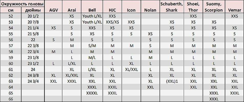 Первым шагом будет измерение окружности головы по уровню выше уха сантиметровой лентой. Каждый более-менее известный производитель мотошлемов имеет в активе таблицу размерной сетки. Отметим: значения в таблице у каждой фирмы разные, они не совпадают.